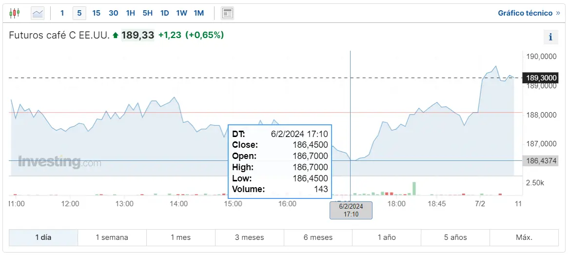 Gráfico de las cotizaciones del café en un espacio de tiempo de un día
