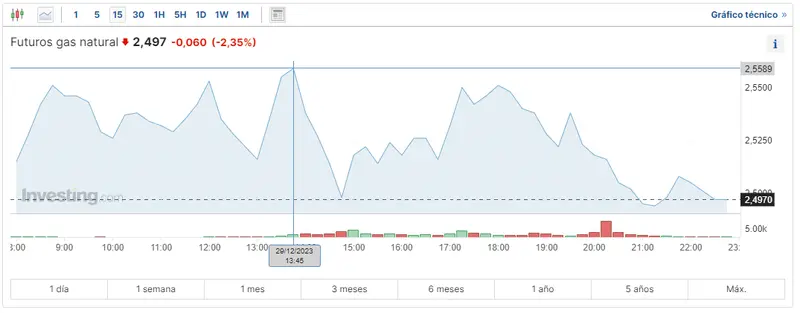Gráfico de las cotizaciones del gas natural en un espacio de tiempo de un día