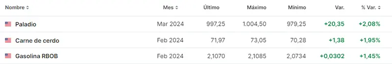La gran subida del mercado de las materias primas ha traído un cambio de tendencia increíble para las materias primas que analizamos a continuación. Este momento es crucial para las brucas subidas del paladio, de la carne de cerdo y del precio de la gasolina, subiendo los tres activos por encima de las cotizaciones de la sesión de ayer. Los siguientes son los máximos que encuentra el precio del paladio. ¿Cuánto cotiza la carne de cerdo hoy? Lo cierto es que las subidas del precio de la gasolina reformulada se alzan un 1.46%.