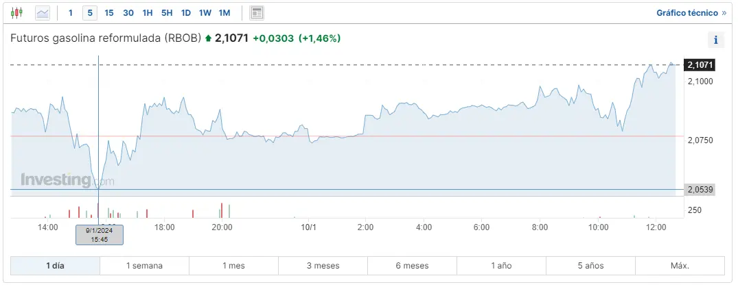 Gráfico de las cotizaciones de la gasolina reformulada en un espacio de tiempo de un día
