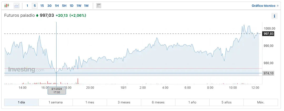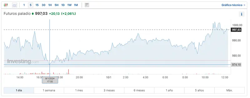Gráfico de las cotizaciones del paladio en un espacio de tiempo de un día