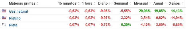 Graves errores en el precio del gas natural (5.55%) con caídas en la plata y el platino