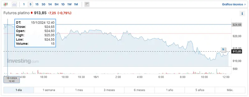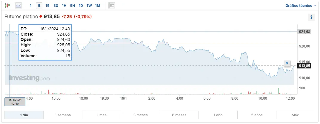 Gráfico de las cotizaciones del platino en un espacio de tiempo de un día