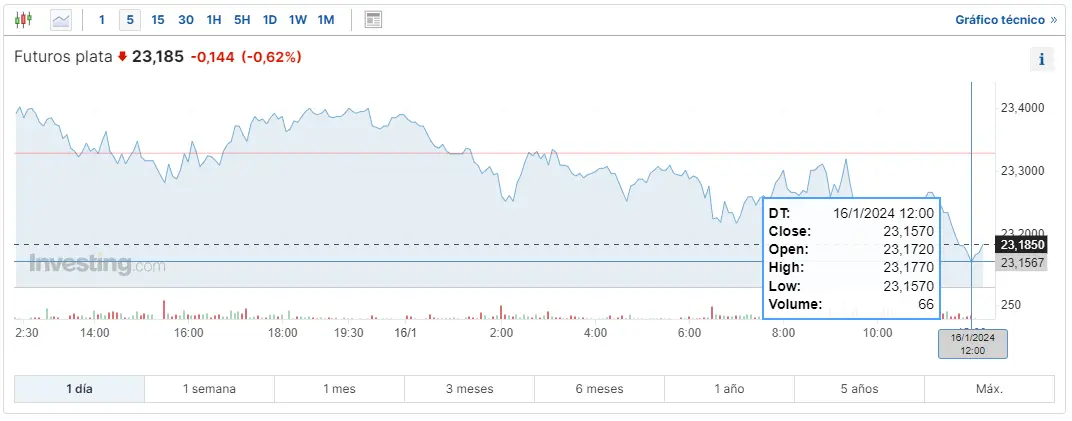Gráfico de las cotizaciones de la plata en un espacio de tiempo de un día