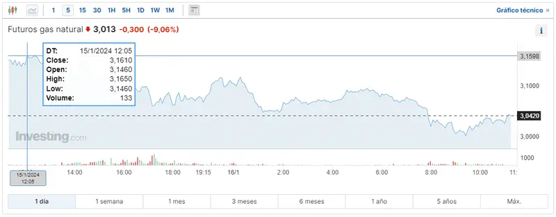 Gráfico de las cotizaciones del gas natural en un espacio de tiempo de un día