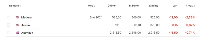 Tabla con las cotizaciones de las materias primas más volátiles del mercado