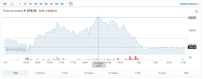 Gráfico de las cotizaciones de la avena en un espacio de tiempo de un día