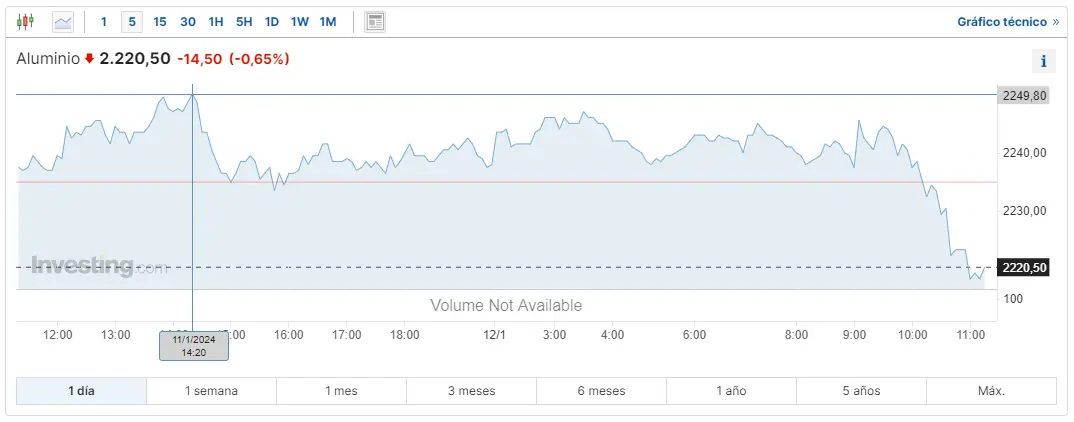 Gráfico de las cotizaciones del aluminio en un espacio de tiempo de un día