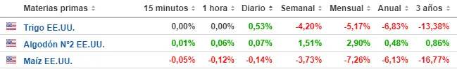 Tabla con las cotizaciones de las materias primas del mercado de valores