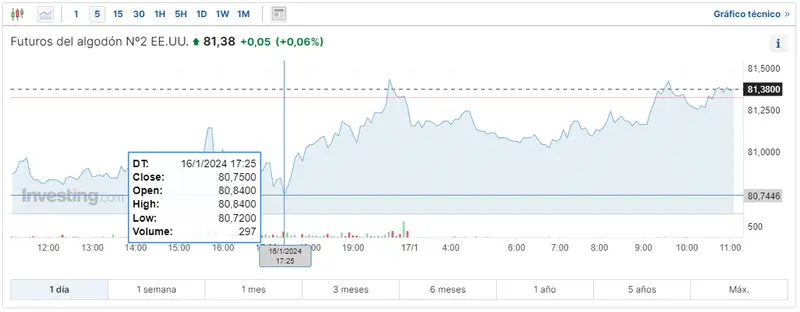 Gráfico de las cotizaciones del algodón en un espacio de tiempo de un día