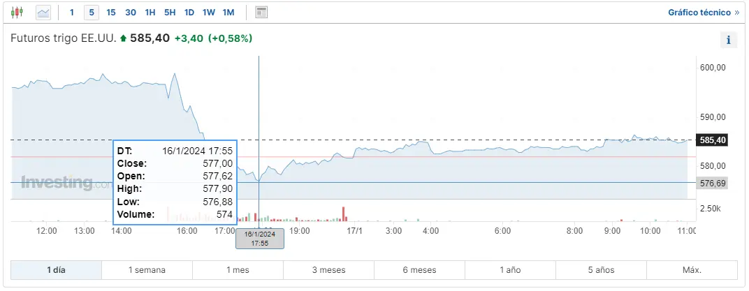 Gráfico de las cotizaciones del trigo en un espacio de tiempo de un día