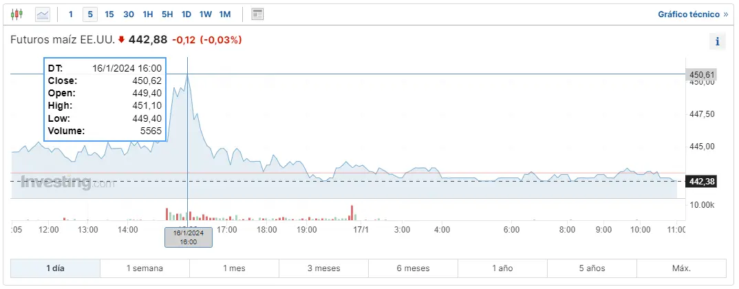 Gráfico de las cotizaciones del maíz en un espacio de tiempo de un día