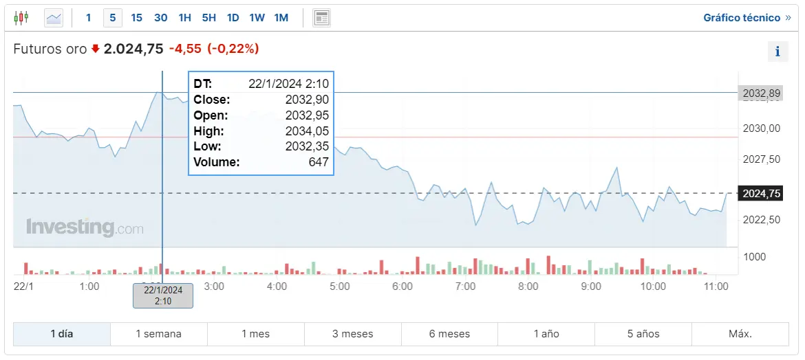 Gráfico de las cotizaciones del oro en un espacio de tiempo de un día