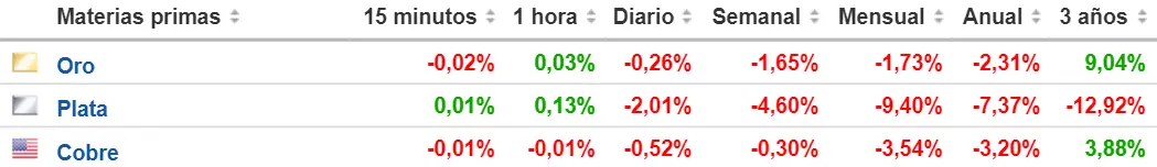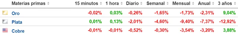 Tabla con las cotizaciones de las materias primas más populares del mercado