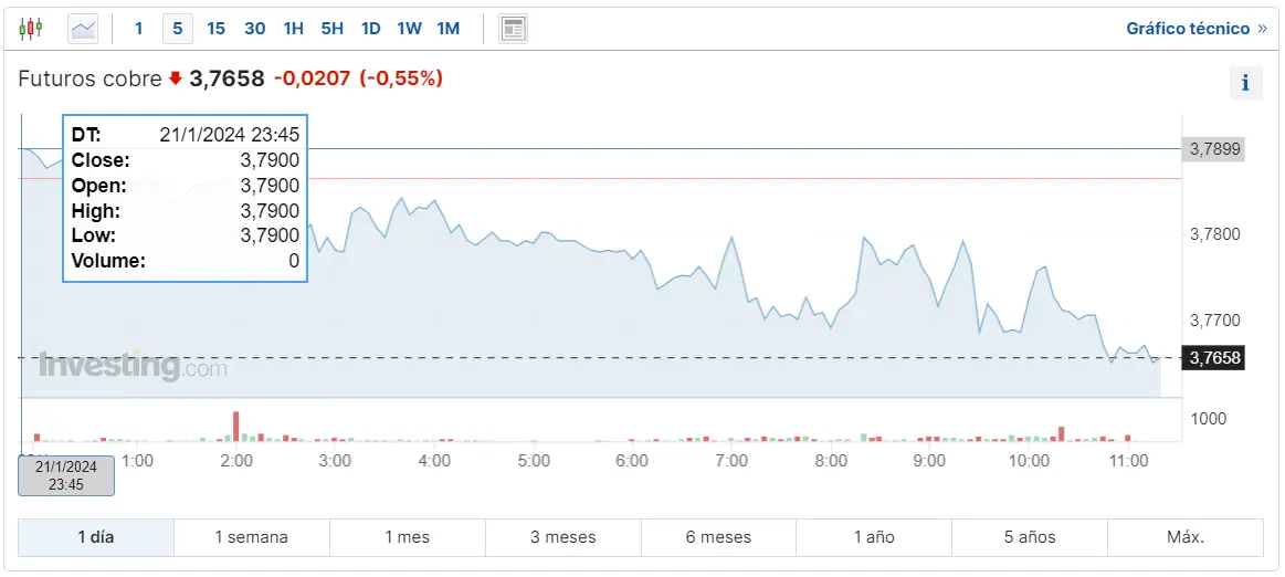 Gráfico de las cotizaciones del cobre en un espacio de tiempo de un día de las materias primas