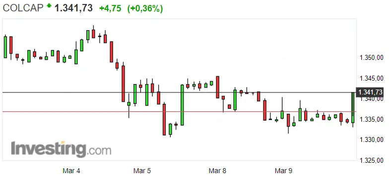 El índice colombiano se mantiene en verde, alzando nuevas subidas con cotizaciones del momento actual de unos 1341.73 puntos, lo que entendemos por subidas de 4.75 puntos; el 0.36%. Aunque creciente, el índice COLCAP sigue oscilando entre sus dos niveles, el S y el R. El nivel de resistencia lo vemos en 1339.78 puntos, a diferencia de nivel de soporte que encontraremos en unos 1331.62 puntos.