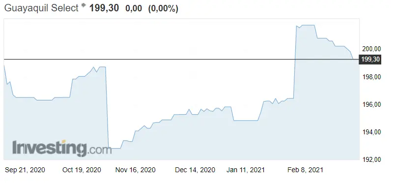Como vemos en el gráfico de abajo, las cotizaciones del índice Guayaquil se mantienen en el mismo nivel durante los útlimos días, con una situación actual de 199.30 puntos. Lo que iba sucediendo desde hace un tiempo era una situación en la que de los 194.85 puntos, que se mantuvieron desde el 5 de enero hasta el 15 de enero, el índice ascendía hacia los 201.77, que se mantenían desde el 5 de febrero hasta el 11 de febrero. Es entonces cuando se desencadena la bajada de las cotizaciones del índice Guayaquil que concluye en el momento actual, con evidente tendencia bajista.