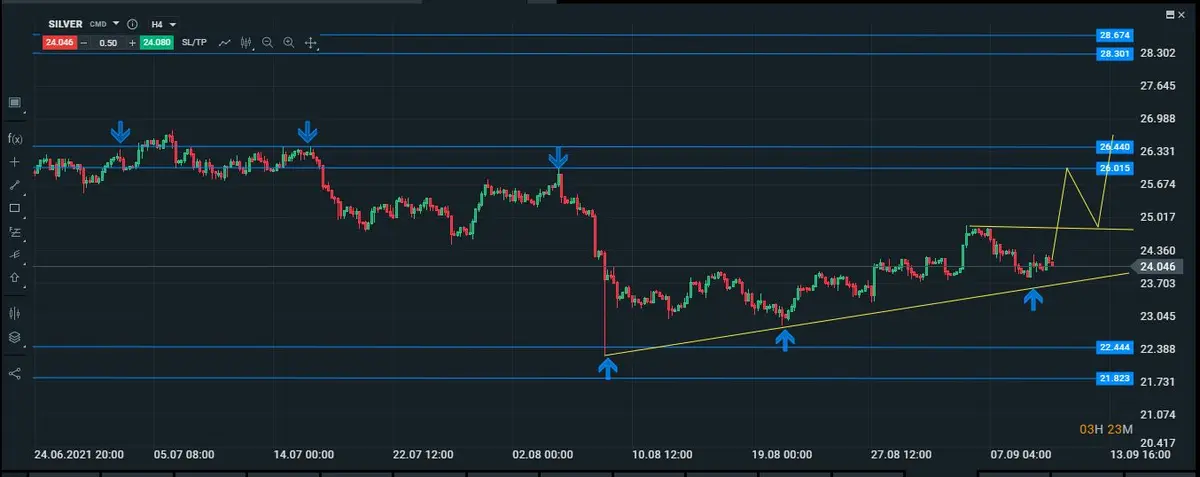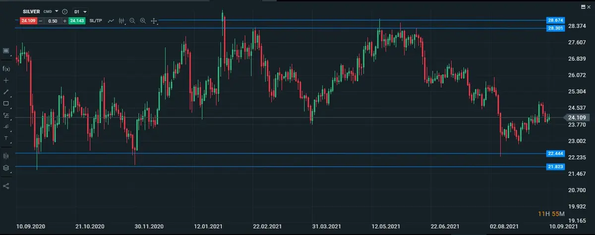 Si miramos la plata por ejemplo en un gráfico diario, podemos observar que sus precios máximos están en los 28.67 puntos y sus mínimos estan en los 21.82 puntos.