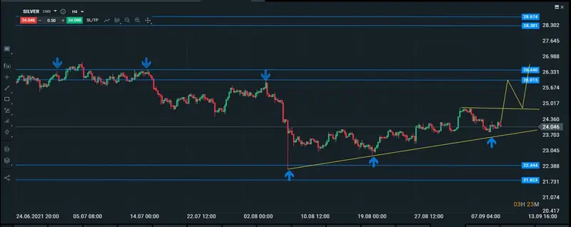 En un gráfico intradiario veremos que luego de haber marcado sus últimos mínimos en los 21.82, el precio de la plata ha comenzado generar lo que vendría a llamarse una tendencia alcista, paraq ue nuestra visión en el activo sea positiva tendríamos que ver roturas de precio en los 24.86 puntos.