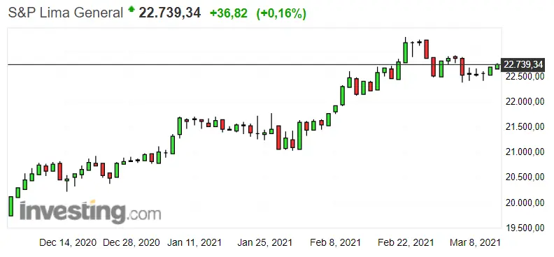 Como ya hemos leído en el título y podemos comprobar en el gráfico de abajo, el índice peruano se encuentra en una subida de sus cotizaciones de hasta 0.16%, es decir de unos 36.82 puntos, dejando las cotizaciones del momento actual en 22739.34 puntos. Si buscamos el nivel de soporte del índice S&P Lima General, lo veremos en 13447.70 puntos, mientras que el nivel de resistencia lo podemos encontrar en 23297.55 puntos.