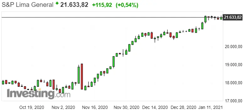 Como ya hemos leído en el título y podemos comprobar en el gráfico de abajo, el índice peruano se encuentra en un ascenso del 0.54%, es decir de unos 115.92 puntos, dejando las cotizaciones del momento actual en 21633.82 puntos. Si buscamos el nivel de soporte del índice S&P Lima General, lo veremos en 16614.38 puntos, mientras que el nivel de resistencia lo podemos encontrar en 21768.82 puntos.