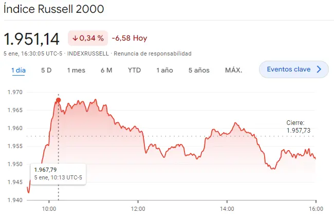 Los valores del índice Russell 2000 han seguido su tendencia en valores importantes en comparación con los demás activos del mercado americano, elevánose en unas caídas brutales para Wall Street. Estos momentos son muy interesantes para el índice Russell 2000 bajando un valor muy grave con unas caídas de unos 6.58 puntos por el índice Russel 2000, perdiendo un porcentaje de hasta un 0.34%. Ahora mismo el índice Russell 2000 deja atrás las cotizaciones máximas de unos 1967.79 puntos, bajando muy por debajo de los cierres de sesión de unos 1957.73 puntos.