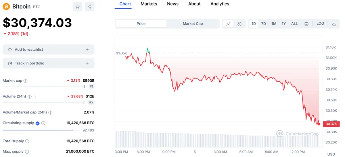 La principal criptomoneda por capitalización se encuentra en un rango diario de 30.297,1 - 30.875,6 dólares