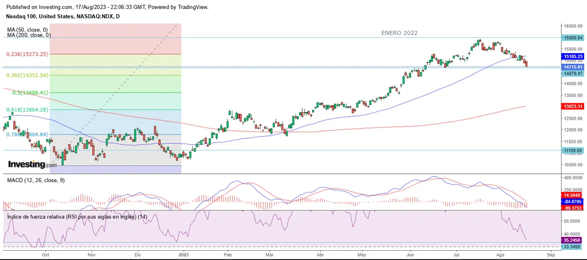 El Nasdaq nos ha dejado una semana claramente bajista, precipitándose casi sobre el soporte marcado en los 14.715 puntos.