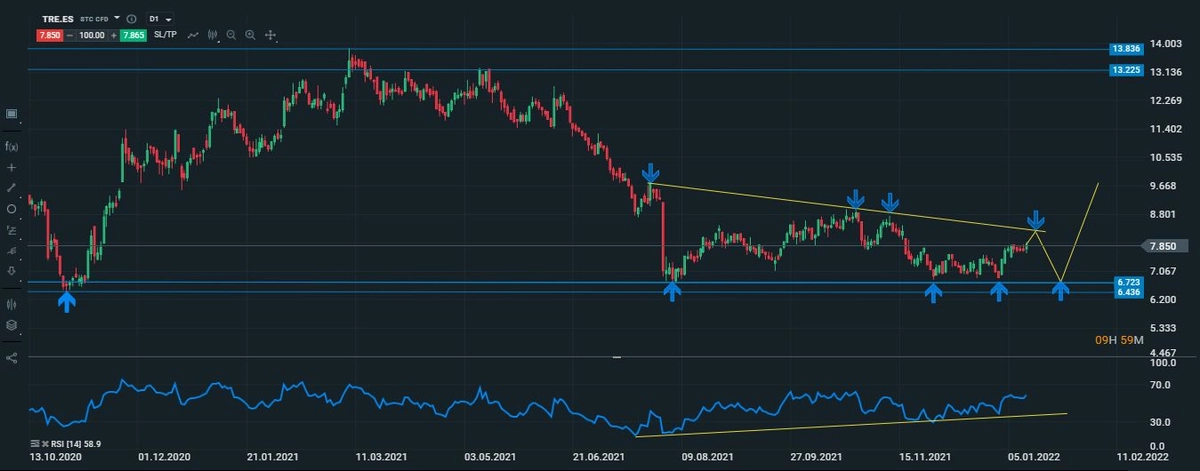 De no darse los movimientos que hemos comentado, lo que esperamos que suceda es que en un principio el precio no consiga superar la línea que une sus máximos decrecientes, y por tanto sufra un movimiento correctivo hasta sus suelos importantes que se encuentran en los 6 puntos, para a partir de allí volver a tomar impulso con la intención de superar la línea que une sus máximos decrecientes, y quién sabe si incluso veremos al precio superar los techos que hemos mencionado antes y que se encuentran en los 8.97 puntos. En lo que respecta al RSI, vemos que un claro movimiento alcista que lleva formándose desde mediados del año pasado y que a día de hoy se mantiene, lo que nos hace pensar de que es posible que veamos al precio superar la línea que une sus máximos decrecientes en las próximas sesiones.