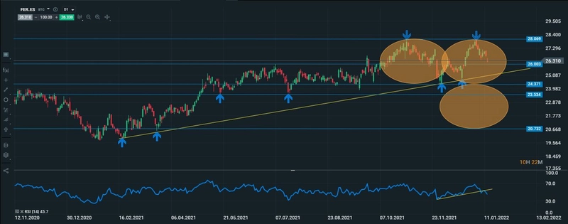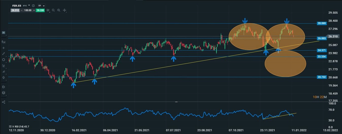Como se puede apreciar en su gráfico diario, Ferrovial ha tenido un buen desempeño el año pasado llegando a los máximos que se encuentran en los 28 puntos, y si tomamos en consideración los suelos en los que se encontraba a principios de año, veremos que el precio de la acción ha tenido una revalorización del 40%, siendo una de las compañías que ha tenido un buen desempeño el año pasado. En la actualidad y como se puede observar en el gráfico, el precio de la acción se encontrado con unos techos que de momento han obligado al precio ha girarse a la baja y como hemos comentado al principio, de seguir con su movimiento correctivo, cabe la posibilidad de que podamos ver activarse el doble techo que de momento parece que se está formando.