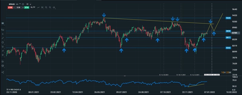 Cabe recordar que esperamos que esto suceda en el mediano plazo, por otro lado hay que tener en cuenta la situación en la que se encuentra el mercado en general, ya que los continuos datos de inflación que vayamos conociendo nos darán un idea de lo que esperamos que suceda en el mercado, mientras tanto en el caso de producirse un serio movimiento correctivo los suelos que se encuentran en los 8617 puntos serán nuestra señal de entrada en caso de que querramos posicionarnos bajistas en el índice, a esto también hay que agregarle los cambios de dirección que se vayan dando en el indicador del RSI, que como se puede apreciar mantiene el tono alcista.