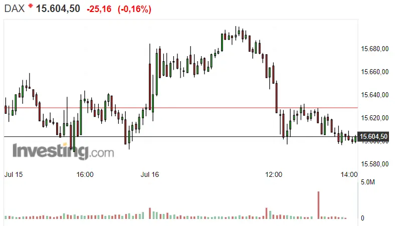 La Bolsa de Alemania, con su indice bursatil Dax 30, se ve hoy empujada por el mismo hacia pequeás pérdidas. Tal y como adelantamos en el título, el índice alemán Dax 30 se profundiza en una bajada dejando la cotizacion del momento actual en unos 15604.50 puntos, es decir, la bajada hasta el momento actual de la que hemos sido testigos ha sido la de unos 25.16 punto; un 0.16%. Si nos centramos en sus niveles de resistencia y soporte, veremos el nivel de resistencia en 15700.15 puntos y el nivel de soporte en 15596.84 puntos.