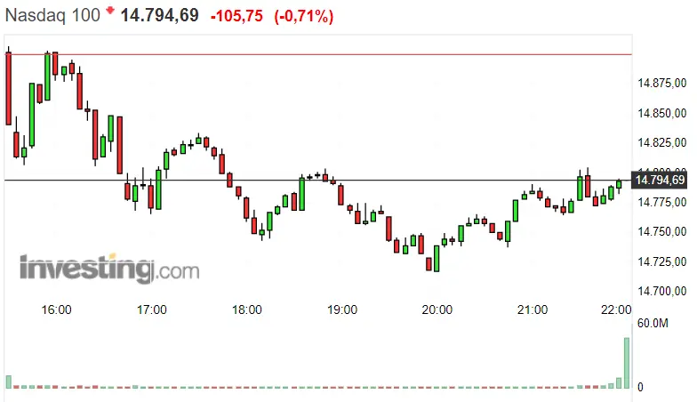 Vemos niveles de soporte y resistecia propios del índice norteamericano Nasdaq 100 bastante dispersos aunque las cotizaciones del momento actual se encuentren más próximas al nivel de soporte que al de resistencia. El nivel de resistencia lo vemos en 14905.87 puntos, mientras que el de soporte lo encontramos en 14718.09 puntos. Si nos fijamos en lo que está sucediendo en el momento actual, veremos una bajada de 0.71% que desciende unos 105.75 puntos, dejando la bolsa de EEUU en rojo. Por tanto, las cotizaciones del momento actual permanecen en 14794.69 puntos.