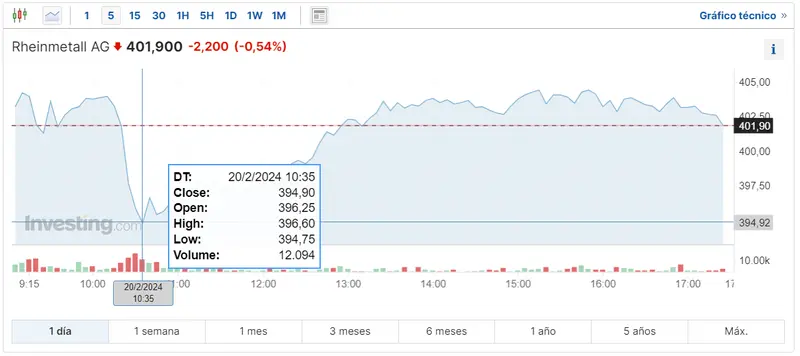En Fráncfort, como ya hemos dicho, el índice DAX 40 caía mientras la armamentística Rheinmetall lidera las ganancias. No obstante, en estos momentos, las acciones Rheinmetall han encontrado unas caídas que han dejado muy malas estadísticas con las caídas de unos 2.2 euros por acción, lo que supondría unas caídas de un porcentaje de hasta un 0.54%, dejando las cotizaciones de la empresa en unos valores de unos 401.9 euros por acción, topándose incluso unos valores mínimos de unos 394.92 euros.