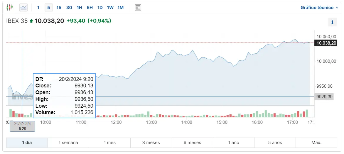 Las subidas siguen manteniendo el índice Ibex 35 en valores que van más allá de las cotizaciones que veíamos como los niveles mínimos. En este momento las acciones del índice Ibex 35 suben hasta un 0.94%, subiéndose unos valores exactos de unos 93.4 puntos, creciendo desde unas cotizaciones mínimas de unos niveles de 9929.39 puntos hacia unas cotizaciones que en sus niveles más fuertes encuentran unos valores de unos 9936.5 puntos, elevándose por encima de las cotizaciones con las que el lunes cerraba la sesión la Bolsa de Madrid en niveles de unos 9930.13 puntos.