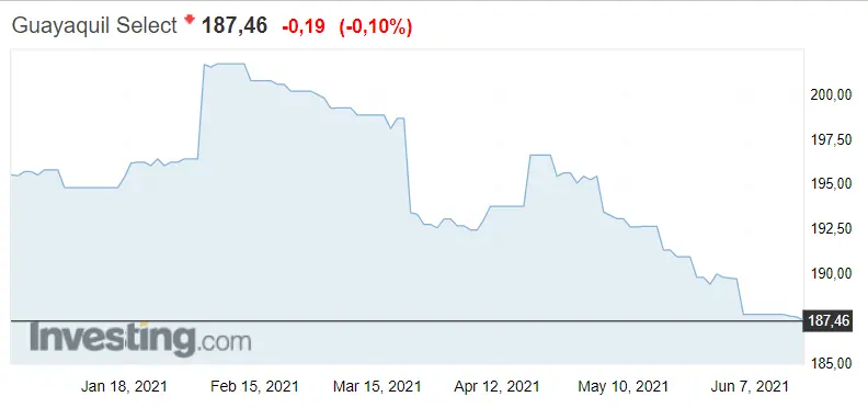 Como vemos en el gráfico de abajo, las cotizaciones del índice Guayaquil se dirigen hacia el sur con una situación actual de 187.46 puntos. Lo que iba sucediendo recientemente era un mantenimiento del nivel de resistencia de 196.69 puntos, que se iba manteniendo desde el 19 al 22 de abril; situación desde la cual comienzan los descensos del índice llevando al momento actual de ruptura de nivel de soporte. Tal como vemos, en estos momentos, con los 187.46 puntos, el índice va superando su punto de soporte. ¿Qué ocurrirá con el índice ecuatoriano en las siguientes semanas? Lo único que podemos confirmar en estos momentos son las bajadas de un 0.1%, es decir; de 0.19 puntos.