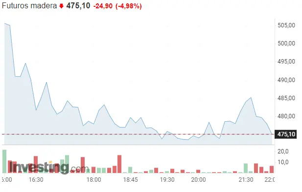 La madera, una de las materias primas que peor se está comportando estos meses. Esta materia lleva en caída libre varios meses ya, donde ha perdido más del 30% de su valor. ¿Hasta dónde va a llegar su precio? Lo que sabemos es que el mercado bajista todavía no ha terminado y probablemente este no sea su fondo ya que hemos visto muchos otros activos perder mucho más valor que el 50% en los últimos años. Hoy baja hasta llegar a un precio de 475 dólares, recuperándose después de varios días positivos, ya que se encontraba en mínimos de 448 dólares.