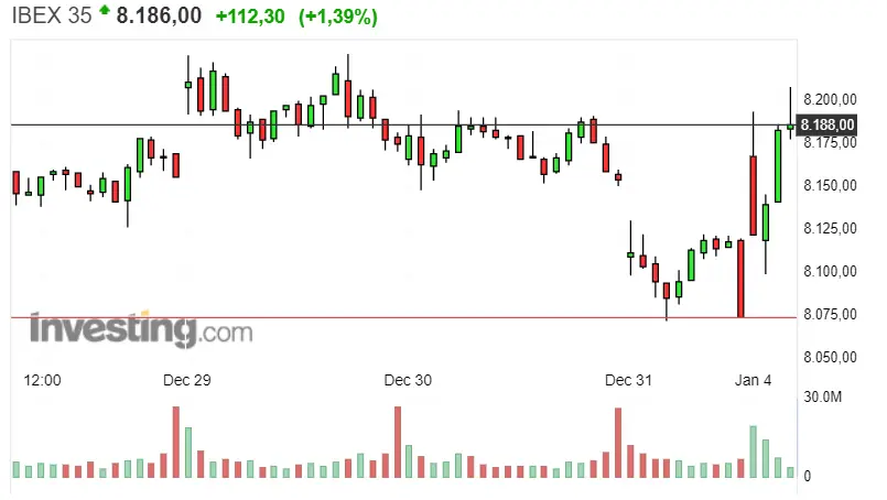 Vemos un gráfico con predominante subida de las cotizaciones del índice madrileño Ibex 35. Se trata de subidas de un 1.39%, que llevan las cotizaciones del momento actual a unos 8188 puntos, es decir; una subida de unos 112.30 puntos. En los inicios del año lo que se dejaba ver era un salto en las cotizaciones hacia niveles más bajos; bajadas de unos 8149.83 puntos a unos 8129.56 puntos. Si nos enfocamos en el nivel de soporte veremos una posición de unos 8072.07 puntos, mientras que el nivel de resistencia es propio de unos 8208.80 puntos.