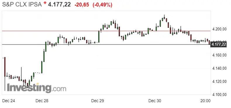 Si nos fijamos en el gráfico de abajo, veremos que la Bolsa chilena con el índice S&P CLX IPSA se mantiene con bajadas que dejan sus cotizaciones en rojo, con descensos de un 0.49%, es decir de unos 20.65 puntos. En el momento actual nos encontramos con unas cotizaciones de unos 4177.22 puntos, que siguen manteniendose entre los niveles de soporte y resistencia bastante distanciados entre sí. El nive de soporte es el primero que observamos, y lo veremos en unos 4133.39 puntos, mientras que el de resistencia se deja ver en unos 4222.39 puntos.