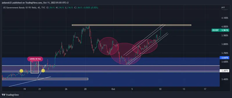Con el petróleo subiendo en la última semana se presiona la inflación y la Fed en los próximos días va tener el dato de inflación para el mes de septiembre, se espera que se ubique en el 8,1%, la inflación es el gran dolor de cabeza para la Fed, el cual quiere buscar objetivos del 2%, los rendimientos suben en las últimas horas hasta la zona de hoy 3,961%.