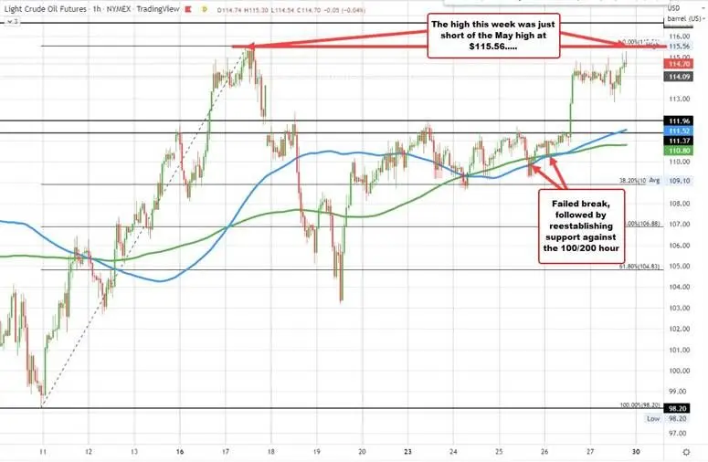 Mirando el gráfico horario a continuación, el precio volvió a moverse por encima de sus promedios móviles de 100 y 200 horas el miércoles. Durante la negociación de ayer, los promedios móviles convergentes mantuvieron el soporte, lo que finalmente condujo a una ruptura del área oscilante entre $111,37 y $111,96. La carrera alcista de hoy llevó el precio a un máximo de $115,30. Eso estuvo justo por debajo del precio alto del 18 de abril de $ 115.56.