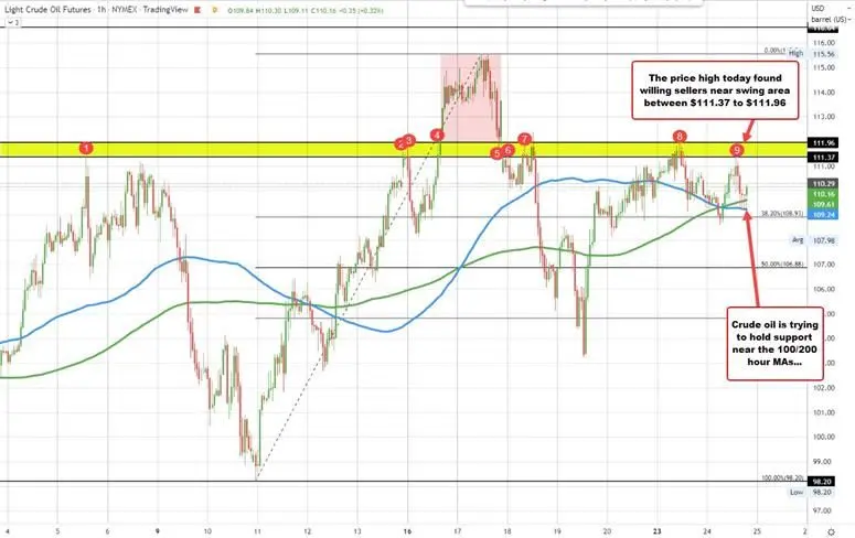 Mirando el gráfico por hora, el precio alto de hoy se estancó cerca de un área oscilante entre $111,37 y $111,96. Los mínimos más recientes están encontrando soporte en las medias móviles de 100/200 horas entre $109,74 y 109,61.