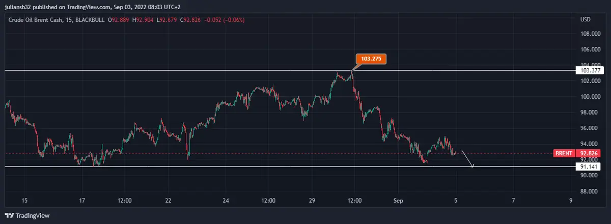Gráfico del petróleo de referencia Brent en temporalidad de 45 minutos fuente tradingview