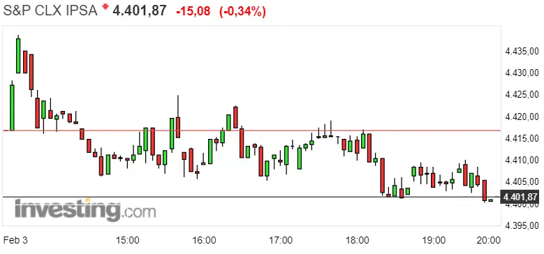 Como ya hemos dicho, el índice chileno está en medio de una bajada que baja el nivel del índice chileno hasta unos 4401.87 puntos, que se van traduciendo en una bajada de un 0.34%, es decir; de 15.08 puntos. A las cotizaciones del índice S&P CLX IPSA le acompaña el nivel de soporte, tanto como el de resistencia. El primero de ellos lo podemos ver en 4400.41 puntos, mientras el segundo se queda por unos 4438.82 puntos.