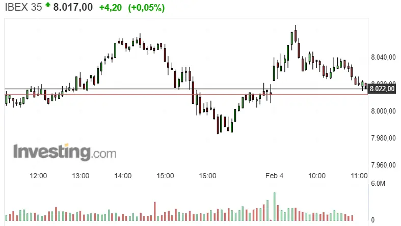 El índice madrileño se nos va quedando en verde, con lo cual vemos ascensos de unos 0.05%, por lo cual vemos una subida de 4.20 puntos hasta quedarse las cotizaciones del Ibex 35 en unos 8022 puntos en este momento exacto. Las últimas subidas y bajadas dejan el nivel de resistencia en unos 8063.92 puntos y el de soporte en 8015.58 puntos. ¿Hasta qué punto tendrán influencia en la Bolsa los resultados del boletín económico del BCE y las ventas minoristas de la zona del euro? No nos perdamos de vista el reciente salto en las cotizaciones del Ibex, de unos 8019.82 puntos a unos 8023.10 puntos.