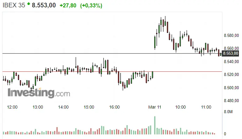 El índice madrileño se nos va quedando en verde, con lo cual vemos ascensos de unos 0.33%, por lo cual vemos una subida de 27.80 puntos hasta quedarse las cotizaciones del Ibex 35 en unos 8553 puntos en este momento exacto. Las últimas subidas y bajadas dejan el nivel de resistencia en unos 8610.17 puntos y el de soporte en 8548.39 puntos. Tampoco nos perdamos de vista el salto ascendente en las cotizaciones del Ibex 35, que lo impulsaba de unos 8525.22 puntos hacia unos 8558.32 puntos.