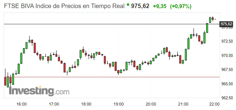 Subidas que dejan el índice mexicano con cotizaciones de 975.62 puntos son las que marcan la trayectoria del FTSE BIVA. Entre las subidas y bajadas, vemos el nivel de resistencia de unos 977.01 puntos, con un nivel de soporte en 964.59 puntos. No obstante, el momento actual se sigue caracterizando por pendientes alicstas de un 0.97%, ascendiendo unos 9.35 puntos.
