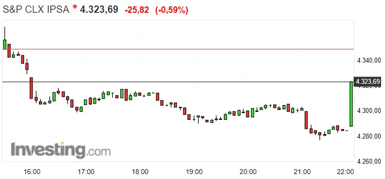 El índice chileno S&P CLX IPSA se ve hoy iluminado de color rojo, presentado descensos de unos 25.82 puntos, es decir; del 0.59%. La cotizacion del momento actual es de unos 4323.69 puntos oscilando en todo momento entre dos picos que se convierten en los puntos de soporte y resistencia. El nivel de resistencia es el que vemos en unos 4326.94 puntos, mientras que el nivel de soporte lo vemos en unos 4277.12 puntos.