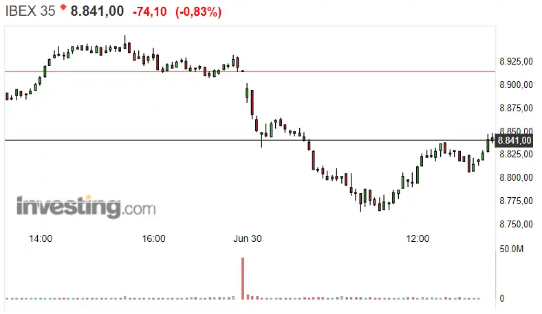 El ibex 35 hoy se ve en rojo, con su cotizacion de 8841 puntos. Esto último es consecuencia de unos descensos de unos 74.10 puntos, lo que va siendo un 0.83%. Si nos fijamos mejor en su trayectoria veremos dos niveles de nuestro interés; el nivel de resistencia y el nivel de soporte. El primero de ellos lo vemos en unos 8901.42 puntos (consecuencia de un bajón desde los 8913.61 puntos), quedándose el nivel de soporte en unos 8764.09 puntos. La cotizacion ibex 35 aún está por darnos algún que otro susto.