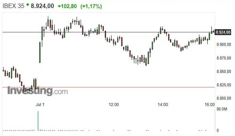 El índice de madrid se nos va quedando en verde, con lo cual vemos ascensos de unos 102.80 puntos hasta quedarse la cotizacion del Ibex 35 en unos 8924 puntos en este momento exacto. Las ganancias que vamos viendo son de un 1.17%. Las últimas subidas y bajadas dejan el nivel de resistencia en unos 8952.86 puntos y el de soporte en 8861.45 puntos.